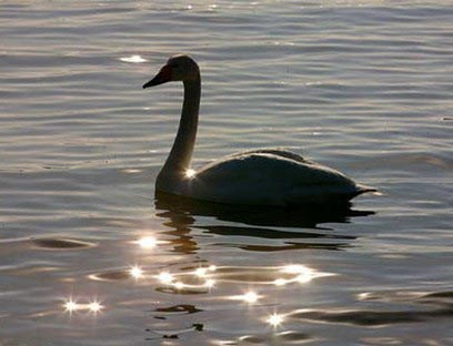 前不久,一个初春的午后,我终于随同事一起,驾车来到了向往已久的天鹅湖畔。远远望去,金色的沙滩拥住一湖碧水。湖面上,粼粼波光闪烁跳跃,一只只洁白的大天鹅正悠然自得地泊在温暖的港湾里;还有许多天鹅张开双翅,沿着湖面盘旋飞翔,发出声声低鸣。通过同事的相机,我近距离地观看了天鹅,它们三五成群,身体随着微波荡漾,姿态优雅迷人。同事对我说:“看!那三只就要出海觅食了!”果然,有三只天鹅展翅起飞,很快消失在山后的海深处。同事凝视着天鹅湖,向我讲诉起他与天鹅的故事。